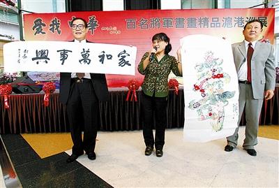蔡志芳(中)在百名将军书画精品沪港巡展上展示介绍有关作品