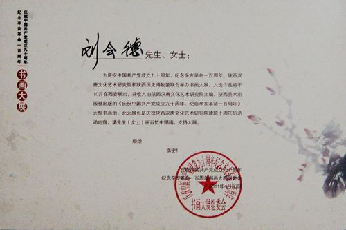 为庆祝中国共产党成立九十周年、纪念辛亥革命一百周年、陕西汉唐文化艺术研究院和陕西历史博物馆联合举办书画大展,入选作品将于10月在西安展出,并收入由陕西汉唐艺术研究院主编,陕西美术出版社出版《庆祝中国共产党成立九十周年、纪念辛亥革命一百周年》大型书画册,此大展也是庆祝陕西汉唐文化艺术研究院建院十周年活动内容,请刘会德先生在百忙中赐稿,支持大展。