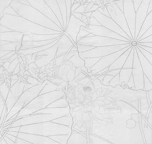 1、定稿后把熟宣纸放在已起好的稿子上面,直接用较浓的墨勾荷正叶,中等浓度的墨勾荷反叶和水草及荷梗,淡墨勾花头。