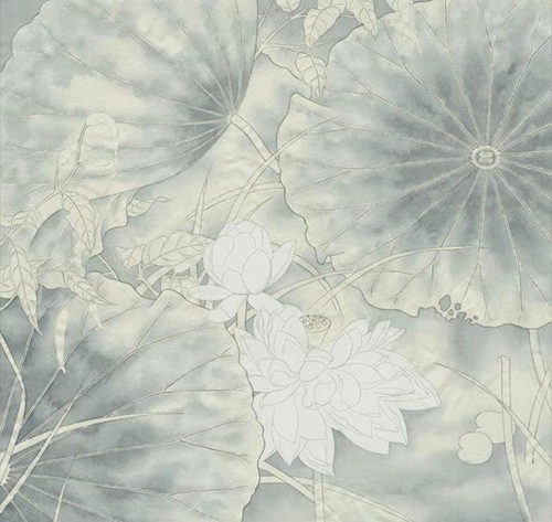 2、用淡白粉平涂花头,注意不要太浓。酞青蓝+墨分染荷叶及背景,可以多分染几次。