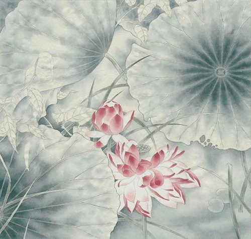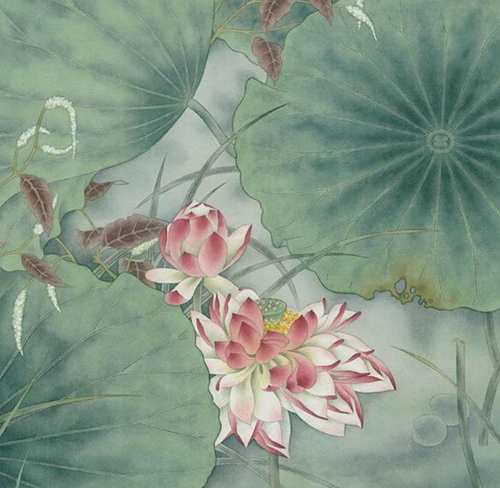 4、用灰绿(酞青蓝+黄+朱磦+墨)染花的暗部,然后再用黄色罩染一下。莲蓬用石绿分染一下,然后也用黄色罩染。接着用黄色加朱磦点花蕊,白色丝花丝。荷叶用酞青蓝+黄平涂一次,然后用酞青蓝+黄色+朱磦+少许墨再平涂一次。水蓼用胭脂+墨分染叶子,白色加少量黄点水蓼花。水草平涂绿色后用黄+朱磦+墨染尖部,荷叶的虫咬处也用此色分染一下。