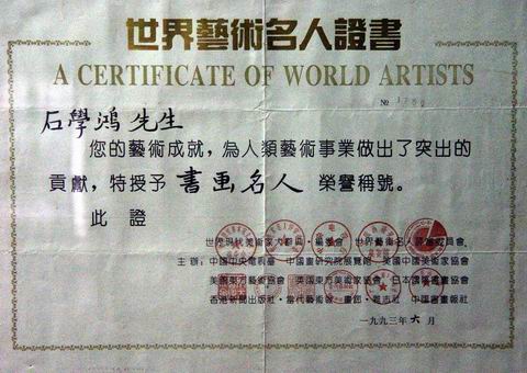 十六家中外专业机构授予“世界书画艺术名人”并颁发证书