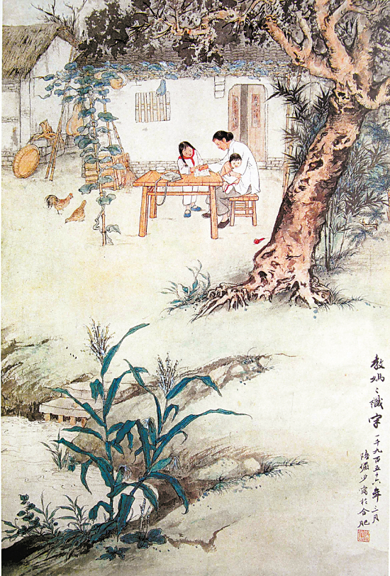 在本人书画鉴定经历中,我总结过造假者“发明”的怪招,其中一招可谓四两拨千斤,这种作伪手段相对较难发现母本,且不用在母本是否难于被发现上动脑子,只要以张冠李戴就足已迷惑大众——它就是“更名克隆”造假法。十多年以前,我首次揭开了此种作伪的秘密:20世纪90年代初期,我参加了西泠印社出版社出版的《陆俨少作品精粹》一书的编辑工作,当时为了能全面客观地反映陆老一生的艺术创作风貌,我们特别在意收编一些存世量较少的该画家中早期创作的特殊类型的作品,图(1)这件《教妈妈识字》作品发表在1956年《美术》杂志的封面上,当时就作为重点收编对像。因为它我们曾经花费了很大的心思去与收藏方联系拍摄与出版的相关事宜,故对此作品印象尤为深刻。我们知道,一些收藏家或机构珍藏的名家真迹之所以不愿意被出版,也是担心将来被克隆后,造假者贼喊抓贼,“母”、“子”不分。可是没有想到出版之后造假者却来了个声东击西:1998年,我出乎意料地在上海某家拍卖行举办的春季拍卖会上看到了一幅似曾相识的《教妈妈识字》作品,它和图(1)“画”的内容几乎一模一样,只是款识部分的字体和部分文字有不同。署名已不是陆俨少,而是摇身一变成了另一位名家“应野平”,见图(2)。于是乎,这种旨在转移视线的“更名克隆”造假方式便浮出了水面。到最近几年,我在各地拍卖会和民间收藏交流中,所接触到的以此种作伪手段炮制的名家伪作那已是不计其数了。