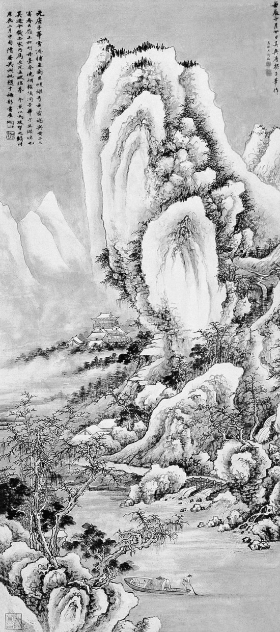 帮我彻底揭开图(1)谜底的是新民晚报2000年9月10日由记者林明杰撰写的一篇题为“老子还是儿子,真迹还是赝品”的文章。果然此画并非吴湖帆所做,表面上吴湖帆的款字是真,谢稚柳的题跋也是真,唯独最重要的山水内容为吴湖帆儿子吴孟欧所画。那为什么吴湖帆和谢稚柳的字迹又会是真迹呢?原来吴孟欧摹古的这幅作品曾在1941年出版在某画集中,见图(2)。吴湖帆在画的左上方为儿子做了题跋,不是题款,造假者在得到图(2)后先将吴湖帆的题跋“变”成题款(恰巧该题跋的文字内容较易于篡改成题款),接着将原作右上方吴孟欧“壬辰十月廿日吴兴唐棣子华作 吴孟欧询临”的原款识(见图(2)局部)挖去,然后让鉴定家谢稚柳续题上“唐子华此图旧藏湖帆先生处此为其所临是中年用意笔形神俱似尤难能也,谢稚柳题”这些跋文(本作者通过电脑分析判定该题跋系署名者真迹)。也就是说这本是一件吴孟欧的摹古画,被改头换面成了吴湖帆的作品,之后再加上谢稚柳的题跋,至此连环套终被解开,这些图让我们看到了铁证如山的一例书画辨伪经典!