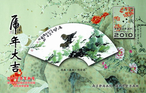 二O一O年南京静海画院、滴水草堂书画网的明信片以高雅、活泼的风格来体现静海画院喜迎虎年新年的到来,特别是画院秘书长张继高的草书“虎”字更显时代的气息,明信片的正面画中以两只迎春待飞的小翠鸟,活泼可爱,此扇面的国画题为“春风”,是画院刘会德院长之作,整幅明信片以赵立军副秘书长的工笔画“迎春”为底衬,明信片的反面左侧是张继高的大幅淡灰色“虎”字!2010静海画院明信片由画院赵立军、可迪广告设计公司王诗玉共同设计。