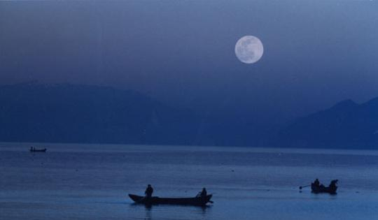 中秋节在洱海中赏月是极好的享受,茫茫的大海、天光、云彩、月亮和海水相映在一起,形成一幅优美的图画,令人陶醉。