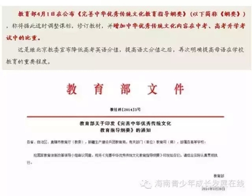 《纲要》对学生学习传统文化做了明确要求: 小学低年级初步感受汉字美,诵读浅近的古诗,获得初步的情感体验,感受语言的优美,了解家乡习俗、传统礼仪,学会待人接物的基本礼节,初步感受经典的民间艺术; 小学高年级熟练书写正楷字,体会汉字优美的结构艺术,诵读古代诗文经典篇目,培养学生对传统体育活动的兴趣爱好; 初中阶段要临摹名家书法,初步了解古诗词格律,阅读浅易文言文,欣赏传统音乐、戏剧、美术等艺术作品,感受其中表达的情感和思想,参加传统礼仪和节庆活动; 高中阶段要阅读篇幅较长的传统文化经典作品,提高古典文学和传统艺术鉴赏能力,增强民族自信; 大学阶段,以提高学生的自主学习和探究能力为重点,培养学生的文化创新意识,增强学生传承弘扬中华优秀传统文化的责任感和使命感。 |