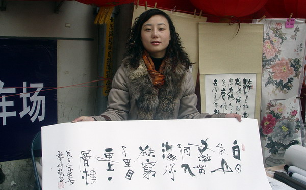 中国手指画研究会会员、中国书画家协会会员、中国书画研究院会员、中国工艺美术家协会会员崔黎娟女士2008年2 月24日在夫子庙古玩字画城现场挥毫为滴水草堂书画网题词。