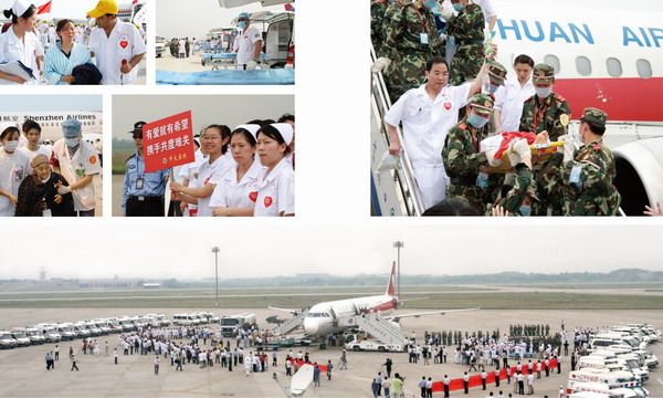 (右上图)救灾血液正在被运上即将开赴灾区的专机上