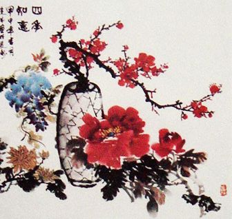 再觀趙誠先生畫梅,先是畫出老幹,再畫枝條,然後再畫花頭、點花蕊和點苔。用墨濃中見淡,淡中見濃,濃淡相宜,虛實相間,提按頓挫,水墨淋漓。如他畫的《春韻》筆意灑脫,勁健有力,生氣盎然,表達了梅花耐寒喜潔的俏麗姿致。而《春夏秋冬》四條屏,則是用紅、綠、黃、白四種色彩,來描繪四季如春的超然景象,構思巧妙,濃妝淡抺,姿態各異。整個畫面有強烈的節奏感。