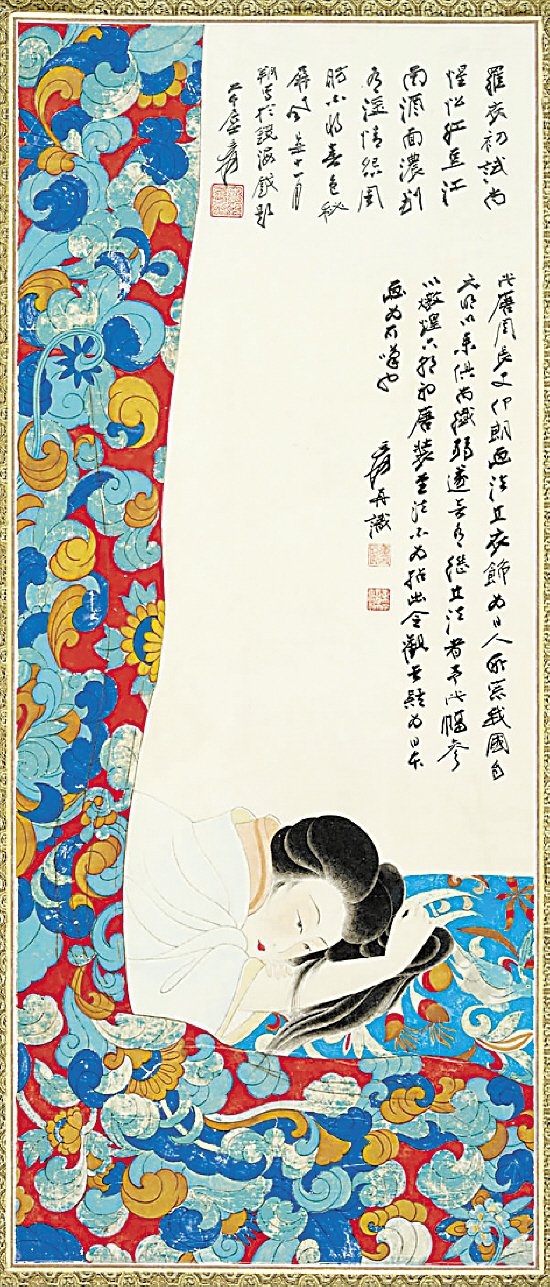 图1有其姊妹本,如图2《情殇图》、图3《春睏图》(130×61cm,纸本设色 镜片,纪年1950年,款识:“长眉懒画尚惺忪,红豆江南酒面浓。薄旧微嗔怨周肪,不将春色秘屏风。庚寅秋张大千爰。”钤印:“西川张爰”、“大千”。)然,通过仔细比照,我们会发现图1的笔墨有值得再研究的必要。