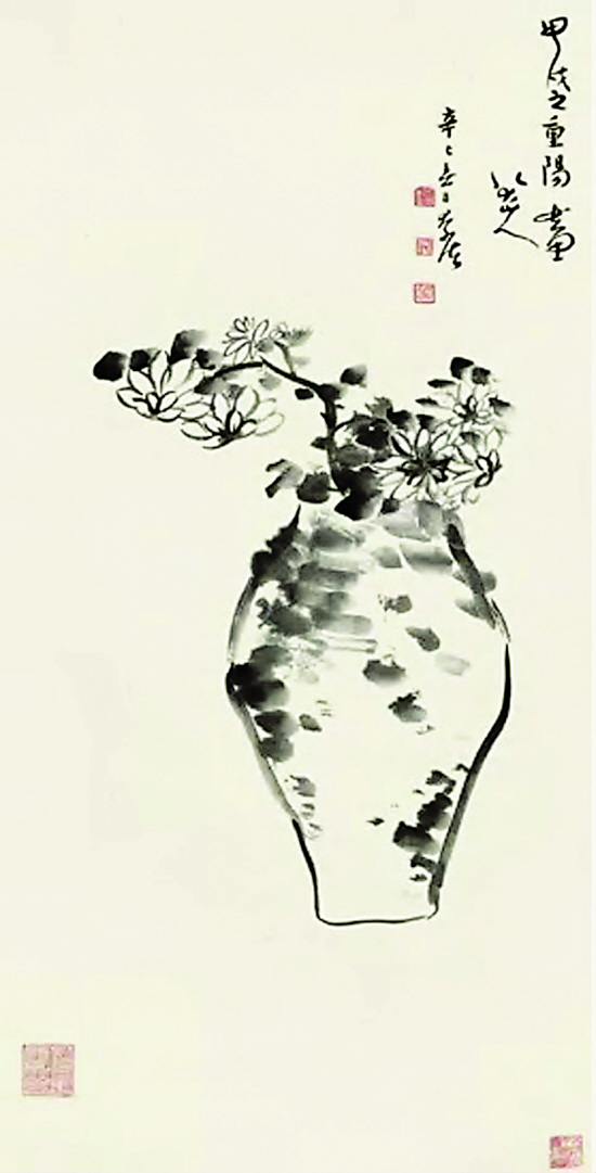 此件署名张大千的图(1)成品在拍卖行现身过数次,其母本图(2)也系我们很熟悉的一幅清代画家八大山人的作品《瓶菊图》。论图(1)成品,它笔墨浮浅,缺失严谨度,像是一位初学者作的临摹品,无论如何与擅长摹古甚至骗过多位鉴定大家眼睛的张氏手迹是“对”不上号的。根据画面迹象判断,这一定是某作伪者先临摹了八大山人真迹《瓶菊图》,然后再在画上伪造出一个像是张大千“摹古”的款识。
