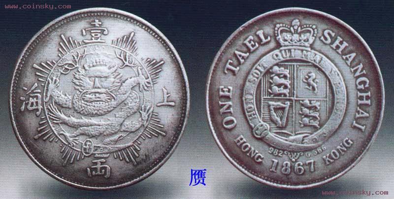 上海壹两银币,铸于同治六年(1867)。此币由上海租界工部局委托英国人设计,请香港造币,一代铸。该币的设计不伦不类,正面为象征大清的蟠龙,币上中文为“上海壹两”,但背面却是英国当时的国徽,采用英国的衡量标准,赫然标上566个英国“格令”(1格令为0.065克),既不像英国币,又不像中国币。因此该枚工部局银币没有正式投产发行,系试铸币。