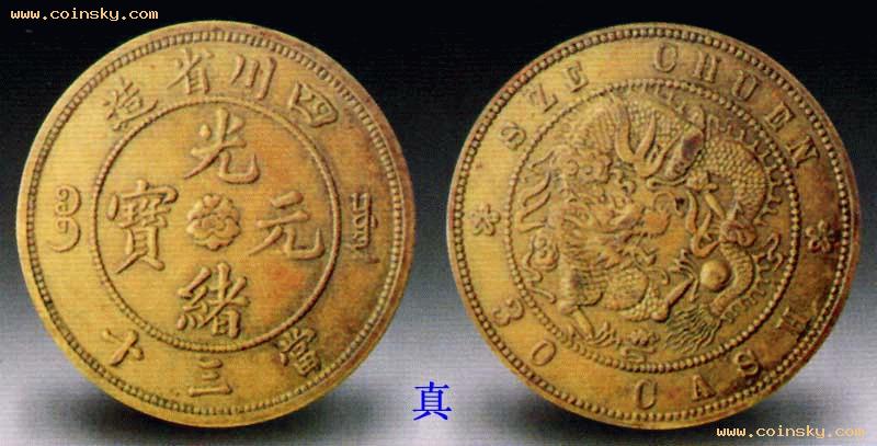 四川省的铜元有“四川官局造”与“四川省造”两大类,前者为光绪二十九年至三十一年(1903—1905),由四川总督岑春煊奏准在成都开铸;后者为光绪三十年至三十一年(1904—1905)由四川银铜元总局制造。当三十铜元为后者,试制于光绪三十年(1904),有飞龙和水龙两种,厚0.24厘米。试铸后未批量投入生产,今存世极罕。