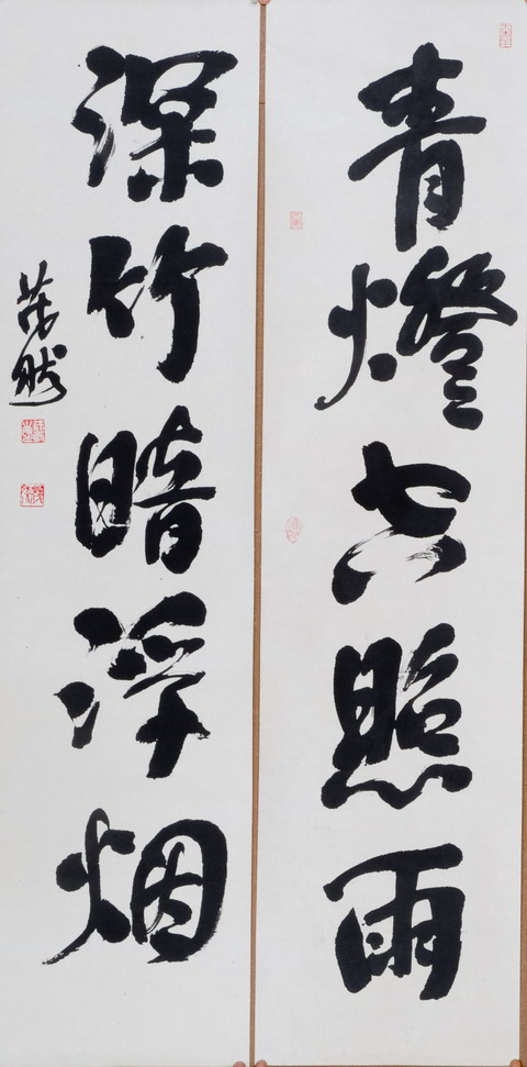 . 对 联 . 徐崇森,原名徐丛生,字茂然,以字行。1959年2月生于南京,少年曾被南京师范大学杨建候教授收为入室弟子学习绘画,又从草圣林散之、冯仲华等名家学习书法,87年毕业于无锡书法艺专,诸体兼擅,尤长于行草与楷书,纵逸洒脱,又时出新意,讲究自然,不主故常,楷书初学欧、颜、赵后专攻魏碑、汉隶。行书以二王为宗,偏钟于《十七贴》、《淳化阁贴》、《兰亭序》等。又遍习历代名家作品,五代杨凝式,明王铎。清黄道周,康有为,赵之谦,何绍基等,遂得悟真行草之法,国画根基坚实,尤其即兴作写意花鸟、山水、笔墨酣畅,富有意蕴,以雅逸清纯为基调。