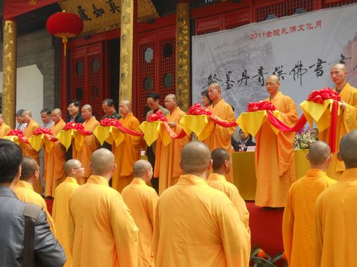4月15日上午9时30分,作为“2011金陵礼佛文化月”的先期预热活动,由南京栖霞古寺、南京市佛教协会、南京市民族宗教事务局主办,南京市云谷书画院承办的“翰墨丹青供佛书画展”在栖霞寺地藏院举行。