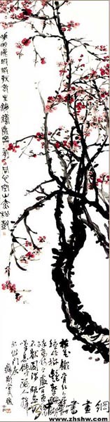 吴昌硕最擅长写意花卉,受徐渭和八大影响最大,由于他书法篆刻功底深厚,他把书法、篆刻的行笔、运刀及章法、体势融入绘画,形成了富有金石味的独特画风,他自己说;“我平生得力之处在于能以作书之法作画。”他常常用篆笔写梅兰,狂草作葡萄。所作花卉木石,笔力得厚老辣,力透根背,又纵横恣肆,气势雄强,布局新颖,构图也近书印的章法布白,喜取“之”字和“女”的格局,或作对角斜势,虚实相生,主体突出。用色上似赵之谦,喜用浓丽对比的颜色,尤善用西洋红,色泽强烈鲜艳。