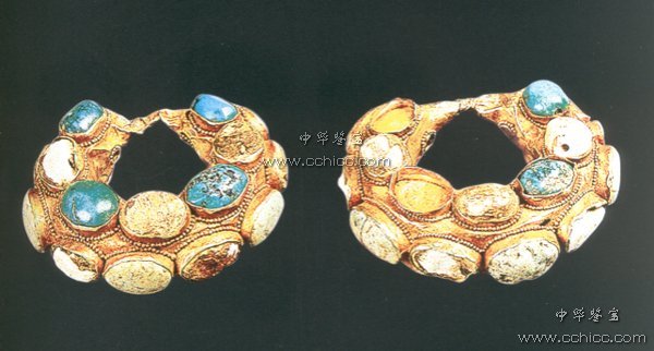 1对。金耳环内镶嵌绿松石与珍珠,错位排列,数量不等。