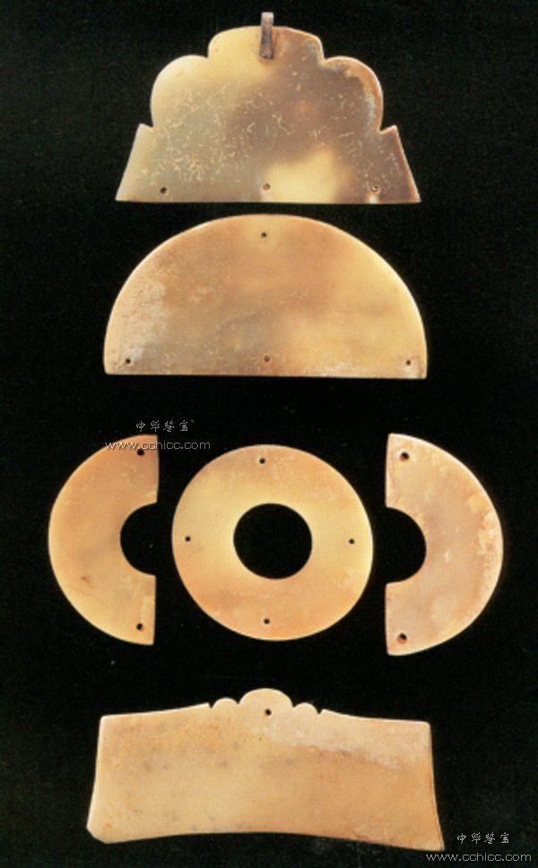 由上至下:云纹边玉珩,长13、高6.9、厚0.5厘米;半圆形珩长,12.4、高5.8、厚0.5厘米;玉璜1对,长7.8、宽3.8、厚0.5厘米,玉璧形佩,直径6.9、孔径2.8、厚0.5厘米;云头梯形佩,长14.5、高5.2、厚0.5厘米