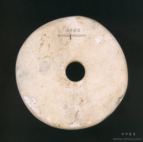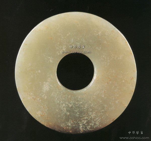青白玉质,透明光亮,表面带有均匀的褐,白色沁斑,扁平圆形,中透圆孔。