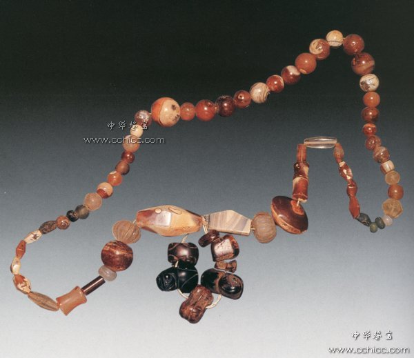 这串项饰由玛瑙,水晶,玉,琥珀,绿松石,料等组成,质地多样,色泽鲜艳,构件多达68件。以玛瑙球最多,是目前贵州出土串饰中组合件数最多,最丰富的一套。