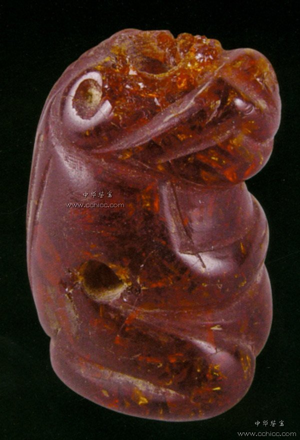 棕色。圆雕,作前肢合抱于胸前跪坐式,抬头,阔嘴、圆鼻,额头部分残,背部饰蝉纹。有两穿,横腰一穿,通头一穿。