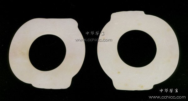 2件。青白玉,杂有黄褐色斑点。造型相同,体扁平,圆形,中心有一圆孔。素面,两侧外缘各凸出一长条形凸棱。