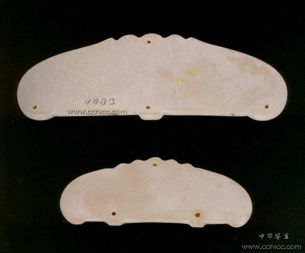 2件。青白玉,光素无纹,杂有黄褐色斑点。一大一小,造型完全相同。呈扁平状云头形,上端呈弧形,中间雕琢有三个弧形,并钻有一小圆孔;下部两端圆弧形,上部正中和下部两个凸脊上各钻一小圆孔,以作系挂之用。