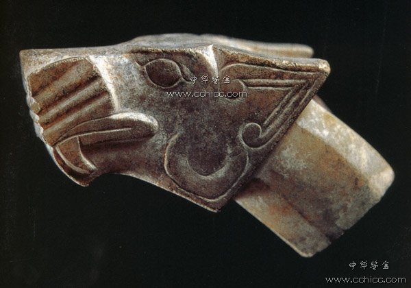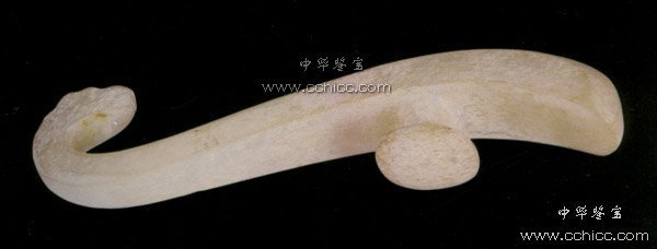 灰白色,局部稍有浸蚀。曲首,尾宽首窄,钩首作龙头状,颈部细长,腹下有一椭圆形纽,纽柱较高。截面为六边形,每二面相交有一棱。