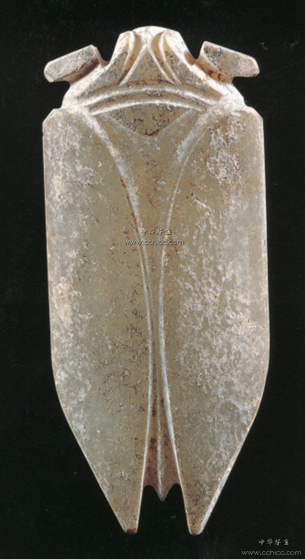 青白玉质,带白色沁斑,蝉首圆弧如峰,双目外突,形体细长,双翼斜收成尖状,腹部以阴线刻绘,雕工远不如东汉遒劲,但仍不失韵味。