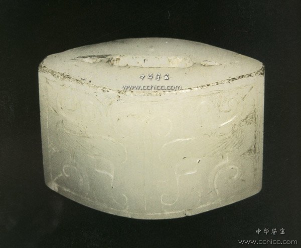 白玉质,保存较好,内有长条形凹槽,两侧各有一小穿孔斜向与凹槽相通,便于固定,两面浅浮雕兽面纹,玉剑首,剑格,剑璏,剑珌同出一墓,同系一剑,系同块玉料琢刻,图像工艺稍逊,应是东晋时作实用玉。