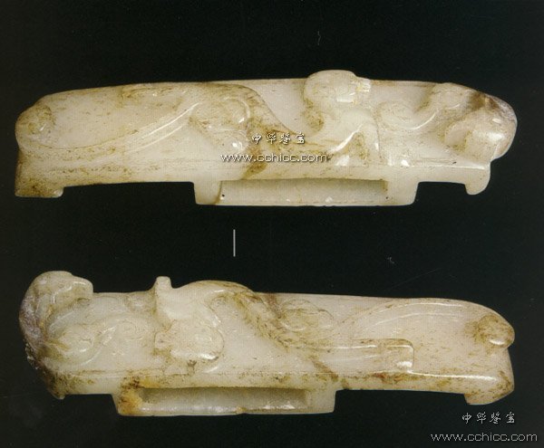 白玉质,局部有褐色沁斑,光洁滋润。形体扁平,修长,下面突出长方形穿孔,表面高浮雕一对螭龙纹,大小相配,嬉戏相对,并用阴线刻绘螭龙细部,形象较为生动。
