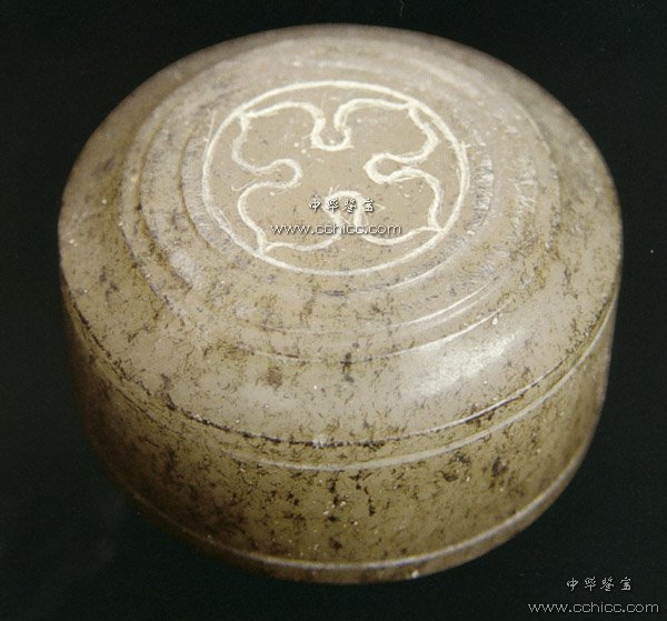 青白玉质,局部有褐色沁斑,圆形,平顶,中空,外壁饰凹弦纹两道,顶部阴刻柿蒂纹