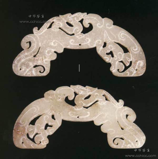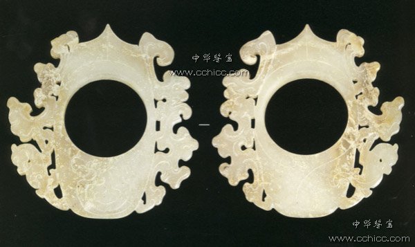 1对。青白色。体扁平,近半璧形,素面,微亮,弧度优美,两端均有小穿孔,一端为双圆孔,制作规整。
