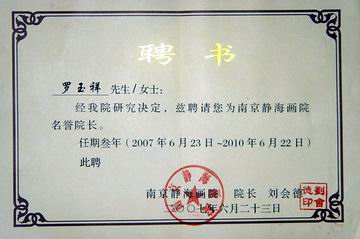 南京静海画院聘请罗玉祥先为静海画院名誉院长证书