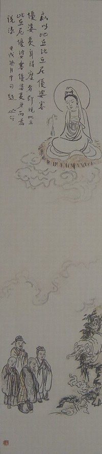 圆霖大师善画观音、西方三圣等佛教人物画。早年工笔,一丝不苟;晚年写意,简约恣意,三笔两笔,形同书写,而人物神情毕现,可见书画同源之精神。笔者曾观赏圆霖大师所绘13幅《观世音菩萨救苦救难图》,此图实则为观音大士救济人间苦厄之13个故事,所以幅幅画面不同。笔者所见《观世音菩萨三十二应身》之19幅应身图,亦图图有别。圆霖大师曾应苏州灵岩寺方丈明学法师之邀,图绘工笔重彩人物画之莲宗十三祖师像,瞻仰之中,但见张张传形、页页传神。同出大师之手的16尊简笔写意人物画,则风格迥异,惟见墨线勾勒,赭色淡着,素雅平淡之中益增佛界气氛之庄严。