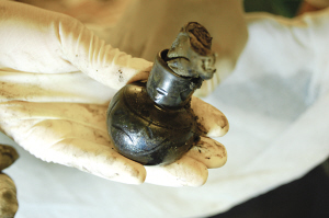 考古人员小心翼翼地为包裹金塔的丝织物进行清洗,把粘在丝织物上的钱币等取出,进展十分缓慢。考古队王先生说:“我们必须按照考古程序进行,要把丝织物上的所有东西都清理完,才能把丝织物揭起。”此时,考古人员从冷藏柜里取出了一个盒子,王鲁湘首先“相中”了位于盒子一角的泥乎乎的东西。考古人员介绍说,那是一件葫芦小瓶,细看可以看出瓶身确实呈现葫芦圆形。“哎,这个葫芦里卖的是什么药?这会不会是古人用来存放灵丹妙药的?”王鲁湘马上又有了“奇妙”的推断。