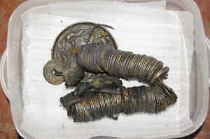 图四:铁函内出土的铜钱和铜镜。