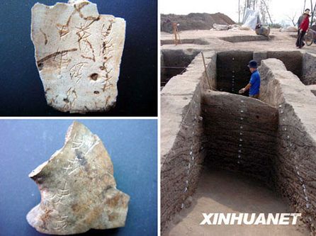 解说:自此,从发现第一片甲骨开始,埋藏了3000多年的历史遗迹一个一个被考古队员发现了。调查的范围从凤凰山下扩大到整座凤凰山。今年3月,制陶作坊在山脚下被发现了;5月7日,西周22座大墓惊现凤凰山第一座山梁,同时发现的还1500米长的夯土墙;6月,在凤凰山第二座山梁又发现了192座西周中型墓葬群,这一系列的发现都和安阳殷墟的发现有着惊人的相似之处。