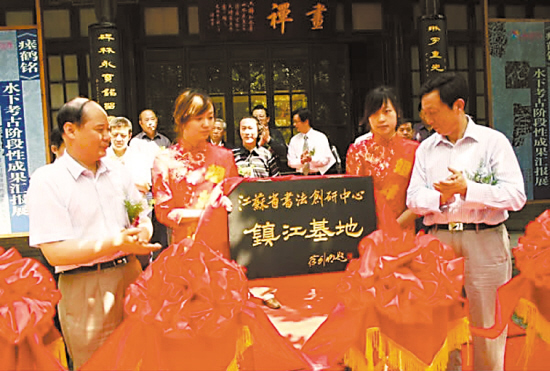江苏省书法创作研究中心镇江基地挂牌仪式在镇江焦山碑林举行。镇江市人大常委会副主任卢章平、副市长王萍、政协副主席宋敬伟、人大教科文卫委主任潘法强、政协教卫文体委主任范然、市政府副秘书长朱金生等领导出席挂牌仪式。南京艺术学院党委副书记黄晓白、江苏省书法创作研究中心主任徐利明教授专程前往镇江参加仪式并为之揭牌。