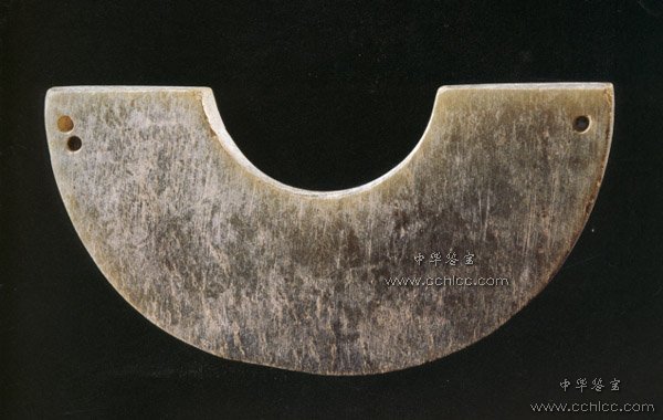 。 25、东晋 玉珩 长7.1,厚0.3厘米 江苏省南京市富贵山墓葬出土,现藏于南京市博物院 青白玉质,通体受沁,表面呈浅白色,玉光莹莹,扁平形状,形如如意云状,又如抽象的鸟形,光素无纹,上面穿有一小孔,下面穿有两小孔。