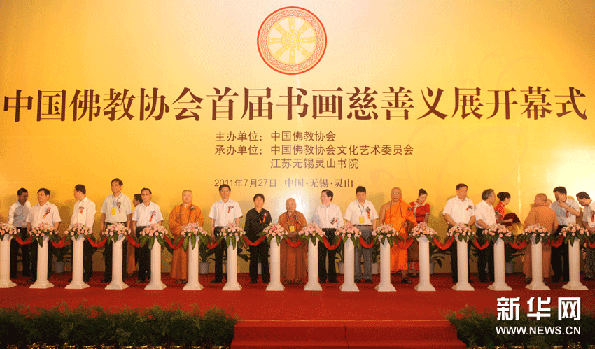 2011年7月27日,中国佛教协会首届书画慈善义展首展开幕式在江苏省无锡市灵山梵宫举行。国家宗教事务局王作安局长、徐远杰司长、陈红星主任,江苏省政协张连珍主席、省政府徐鸣副省长、省宗教局莫宗通局长,无锡市委毛小平书记等领导;中国佛教协会会长传印长老,副会长学诚法师、祜巴龙庄勐长老、觉醒法师、心澄法师,秘书长王健,副秘书长宗家顺、卢浔、胡雪峰喇嘛、吴国平等三大语系佛教界代表,以及义捐书画名家代表出席了开幕式,并为义展开幕剪彩。