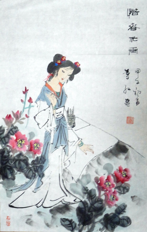 看着她画室里创作的那幅《观世音菩萨》,慈眉善目,仙风道骨,可以说,能画观音的女人自然是不简单的,不但要入情,还要入静,佛意盎然,方能达到真境界。她的作品《轻罗小扇扑流萤》《谁家有女初长成》不但名字好听,更是品味不凡。“怡红院里斗娇娥,娣娣姨姨笑语和。”她画的金陵十二钗美女图莫不是这样别具韵意。她们在花鸟鱼虫的大观园里一个个或站、或立、或卧,个个顾盼生姿,灵动率真。有的侍花,有的司棋,有的抱琴,个个秀丽婉约,如临波弄境,刘普红犹如一块正在开凿的璞玉。不懈的努力,每天的磨砺。使她的作品光芒四射,并有着自己的艺术境界。