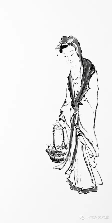 画于上世纪九十年代的《鱼篮观音》轴(图二),[9]是图布局极为简略,去除了山石、水岸的配景,仅绘一仕女。仕女眉目清秀,脸型变长,更加符合世人的脸部特征。仕女右手提着鱼篮,款款而来。如果不是头顶的莲花巾饰,提示人们这是观音的化身,谁不认为这是古装仕女图?