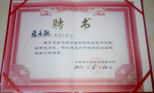 自幼酷爱书法,初临颜真卿多宝塔,后临颜真卿勤礼碑、王羲之圣教序、孙过庭书谱等。2007年参加郑州中原书画院,同年4月参加郑州市书协会员并参加湖南省直机关书画院举办的《纪念邓小平南巡讲话发表十五周年书法大赛》获金奖,评委会授予“新时代艺术开拓者”称号。200712月参加湖南毛体书法研究院组织的《撞历史警钟,铸世界和平全国书法大赛》,被授予“华厦民族笔魂”的光荣称号。2008年参加北京清大华文书画院举办的《奥运寄语2008当代中老年书画家北京奥运邀请展》获“银奖”,作品被北京清大华文书画院收藏。20126月被中国将军书画院河南分院聘为理事。201210月加入河南省中国书画家协会。