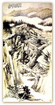 张大千30岁以前的画风可谓“清新俊逸”,50岁进于“瑰丽雄奇”,60岁以后达“苍深渊穆”之境,80岁后气质淳化,笔简墨淡,其独创泼墨山水,奇伟瑰丽,与天地融合。增强了意境的感染力和画幅的整体效果。 |