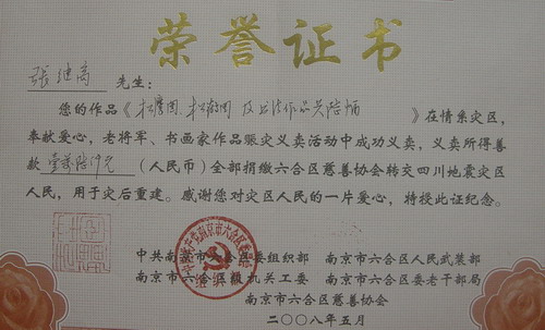二OO八年五月由中共南京市六合区委组织部、南京市六合区人民武装部、南京市六合区级机关工委、南京市六合区委老老干部局、南京市六合区慈善协会联合共同举办“情系灾区,奉献爱心”老将军、书画名家作品赈灾义卖在六合隆重举行,南京静海画院秘书长张继高先生向举办单位捐献《松鹰图》、《松鹤图》等六幅书画作品,义卖所得壹万陆仟元人民币善款全部由南京市六合区慈善协会转交四川地震灾区人民,用于重建家园。