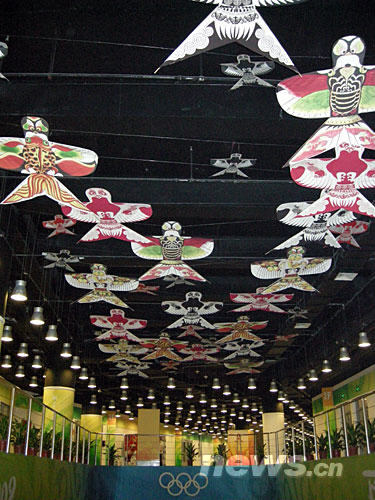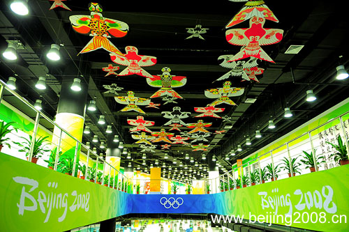 在北京奥运会主新闻中心内拍摄的具有中国特色的风筝造型的屋顶。随着北京奥运会临近,主新闻中心各项工作井然有序地展开