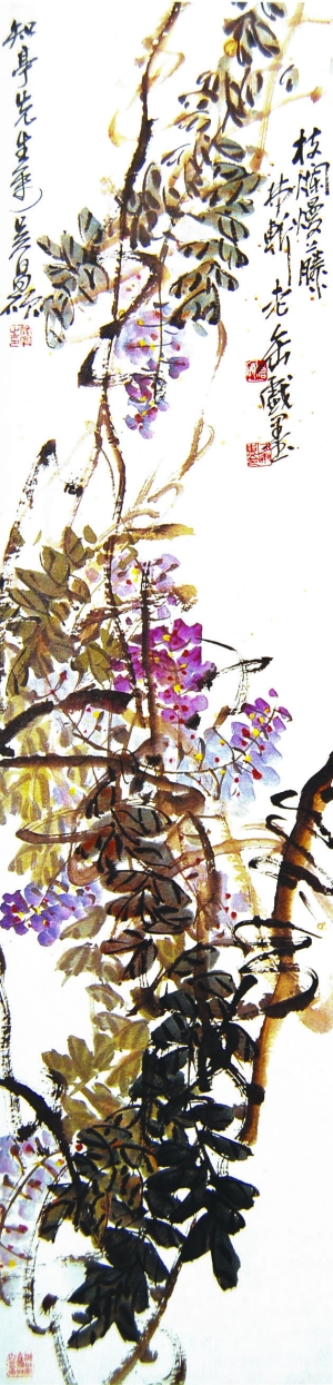 还有一个问题在此要特别说明:改款型“合制”不见得只针对于真迹作品来“深加工”,有些本身即是疑伪的成品,也可能被作成改款型“合制”之成品。举例说,我以前曾在一篇揭伪文章中提到一位擅长“仿制”吴昌硕画派几乎所有名家的造假“高手”,图一这件署名“老壑”(赵云壑)的画作就是那人的“杰作”。该成品画面有斑驳的霉渍,材质较陈旧,首次进南方某拍卖公司拍卖时间是在2004年秋季。之后发生的事就大出了我的意料:在北方另一家拍卖行2005年秋季拍卖会中,它容颜一改,成了图二这般模样。“它”的署名被篡改成了“老缶”(吴昌硕别名,操作者将原来的‘壑’字挖掉再补写上个‘缶’字),画面左上方还被添加了一行署“知亭”上款和“吴昌硕”下款的题款,原成品画面上的三方印章统统被替换,另新加盖了一方吴昌硕常用章。