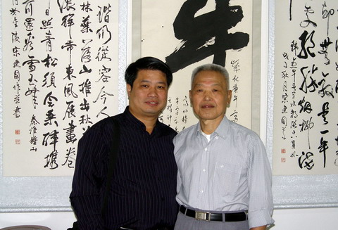 . 高山先生与本书画网负责人赵立军合影 . 高山先生,字胜华,号无为翁,1934年出生。高山先生出身医文之家,祖父高公禹门,字学贡,晚号龙岗道人,清授五品大夫,精医理、善丹青,世称:“两栖”书画家。高山先生幼承庭堂熏陶,六岁开始习字,稍长随长辈学习医理、诗文、书画,先后得同乡前辈书法家张恺帆、萧龙士指教。高山先生学书初由唐入魏,由魏入汉,转而又入唐。于唐习虞、欧、颜、李、柳;于魏习《张猛龙》、《郑文公下碑》、《张黑女》、《嵩山灵庙》;于汉习《张迁》、《礼器》、《石门颂》、《西狭颂》、《乙瑛》、《韩仁铭》、《曹全》。积诸箐华,求似与不似之间,摄神韵又不全似,,使厚、朴、柮、气、力、势达到自然和谐统一,自出机杼,聚为已体。